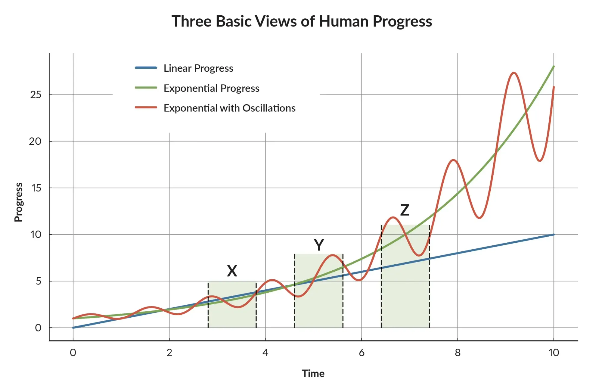 With those caveats, and looking at the line segments marked X, Y, and Z in the figure, we can see how various thinkers could seize upon a particular segment or portion of a segment and argue for progress, regression, or perpetual cycling to derive and support their view. Fundamentalists of the Abrahamic religions (Judaism, Christianity, and Islam) reject evolution, each in favor of their own interpretation of their specific holy book that, they believe, reveals all truth, now and forever. I recall one gospel preacher summarized their case for things going to Hell (which he meant literally) by posing the rhetorical question, “Evolution says man started off dumb and got smart. The Bible says man started off smart [Adam in the Garden of Eden] and got dumb. Look around. Which one do you believe?” For me, having retired and moved from one of the highest socioeconomic status (SES) and lowest crime rate ZIP Codes in California to its inverse, his view takes on far greater face validity here and now than it did then and there. But that’s what can happen when one generalizes from small samples of either time or space.