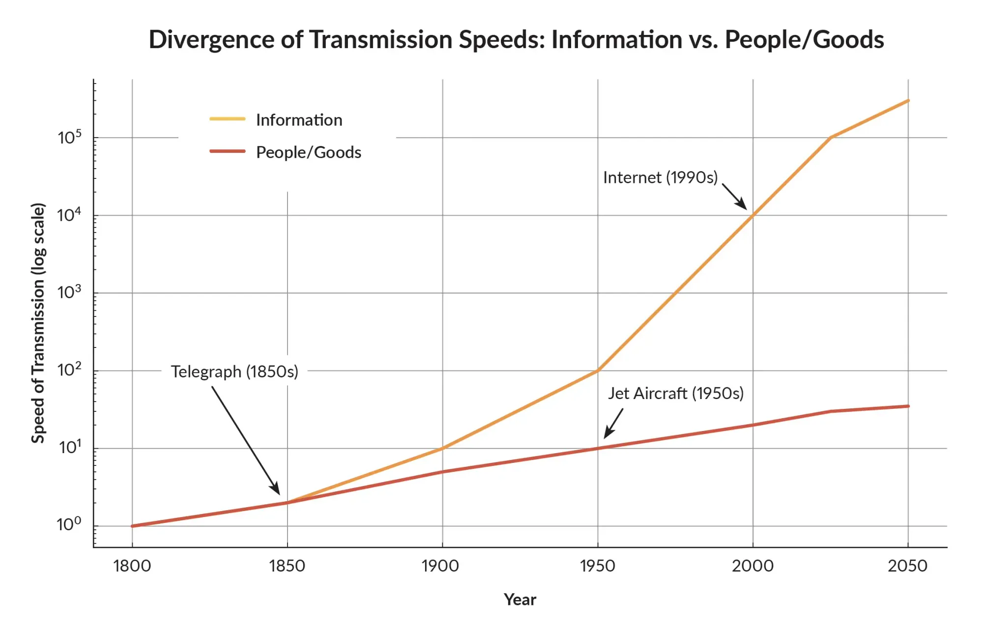 One of the major effects of the increase in the amount of energy we can control is that it has increased the rate at which we can transmit both information as well as goods and people. As shown in Figure 2, starting with the invention and large-scale deployment of the telegraph around 1850 we have been able to transmit massive amounts of information at increasingly faster speeds. (Granted, talking drums, smoke signals, and fire beacons on the Great Wall of China did allow for limited amounts of information to be transmitted faster than humans or goods could travel, but their effectiveness was very subject to weather conditions.) Today, goods and people can travel near the speed of sound (jet airliners) while information can move at near the speed of light (Internet). Faster transmission speed of information also has other benefits, including lesser probability of disruption or loss of information, faster recovery in case of disruption, much greater facility for encryption, and even practical benefits such as near immunity from weather conditions.