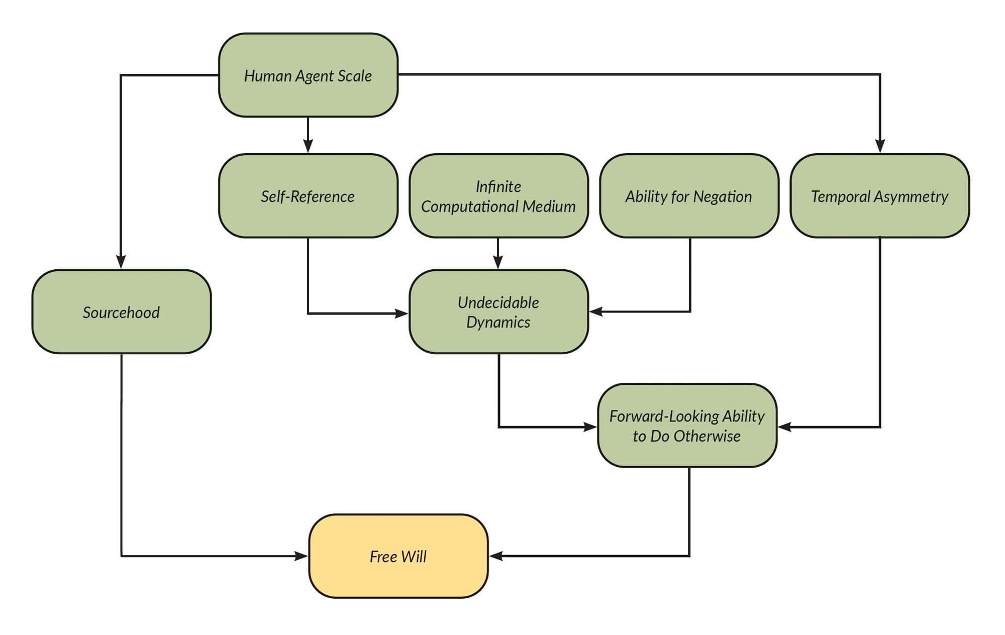 Figure 1 shows the relationships between the concepts discussed in this article. An understanding of the human agent at the scale where conscious humans actually exist leads to recognition of the self as the source of one’s actions, recognition of the relevance of temporal asymmetry to human choice, and recognition of self-reference as causally relevant to human actions. Self-reference, in combination with access to an infinite computational medium and the ability to implement negation results in undecidable dynamics. This entails the ability to do otherwise in the forward-looking sense, which is the only sense that makes any sense when temporal asymmetry is taken into account. The resulting total picture is that we (humans) meet two criteria for real free will: the forward-looking ability to do otherwise and being the source of one’s own actions.