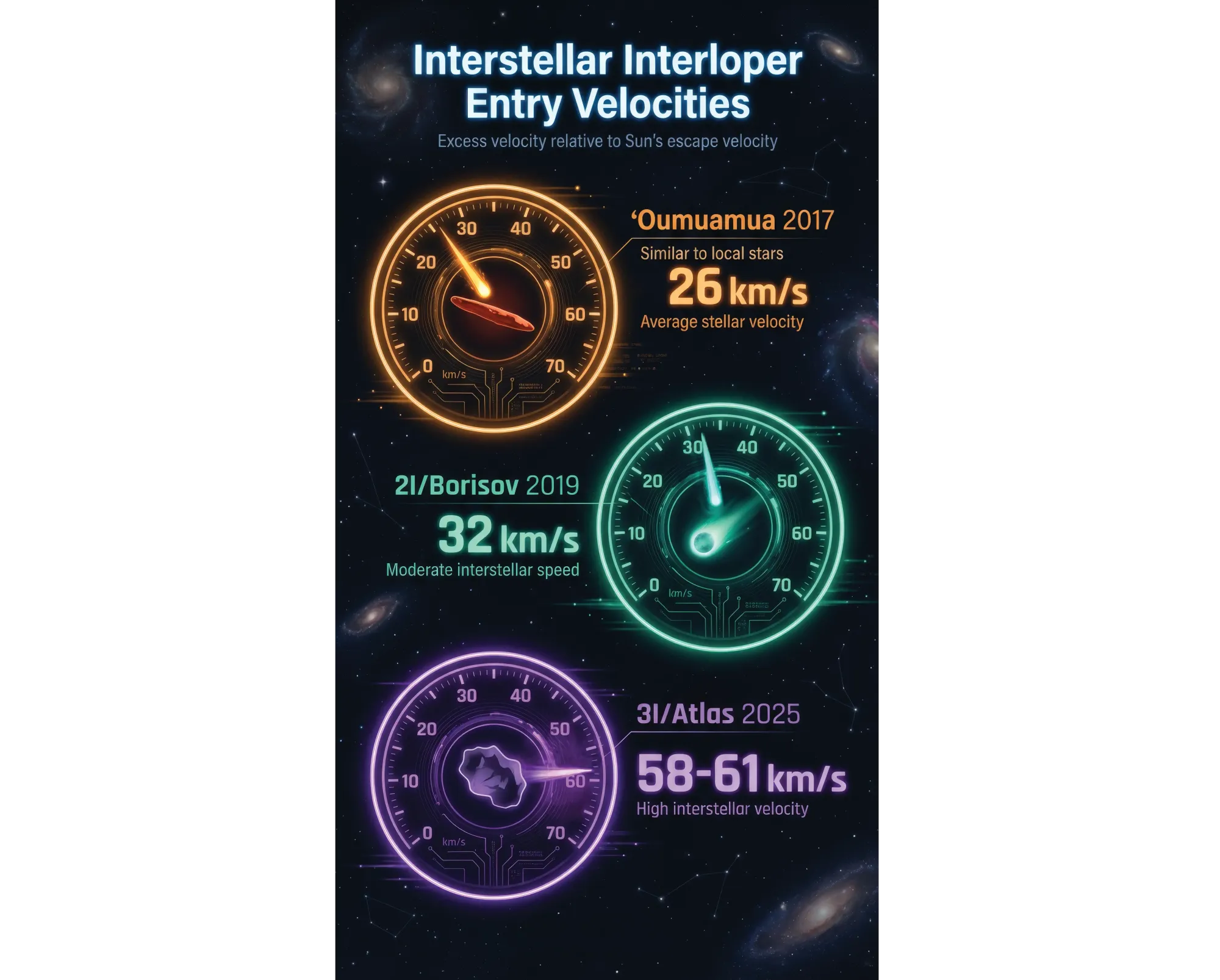 3I/Atlas’s inbound excess velocity was about 58–61 km/s, far above the escape velocity of the Sun, indicating an origin outside the solar system (that is, it is not gravitationally bound to our solar system). Astronomers traced its incoming direction to the constellation Sagittarius and predict it will depart toward Gemini. Unlike the enigmatic ‘Oumuamua (which showed no outgassing) and more like 2I/Borisov, 3I/Atlas immediately revealed a coma and dust activity, behaving in most respects like a typical comet. Its trajectory and motion suggest it may have originated from the Milky Way’s thick disk, making it plausibly older than our solar system.