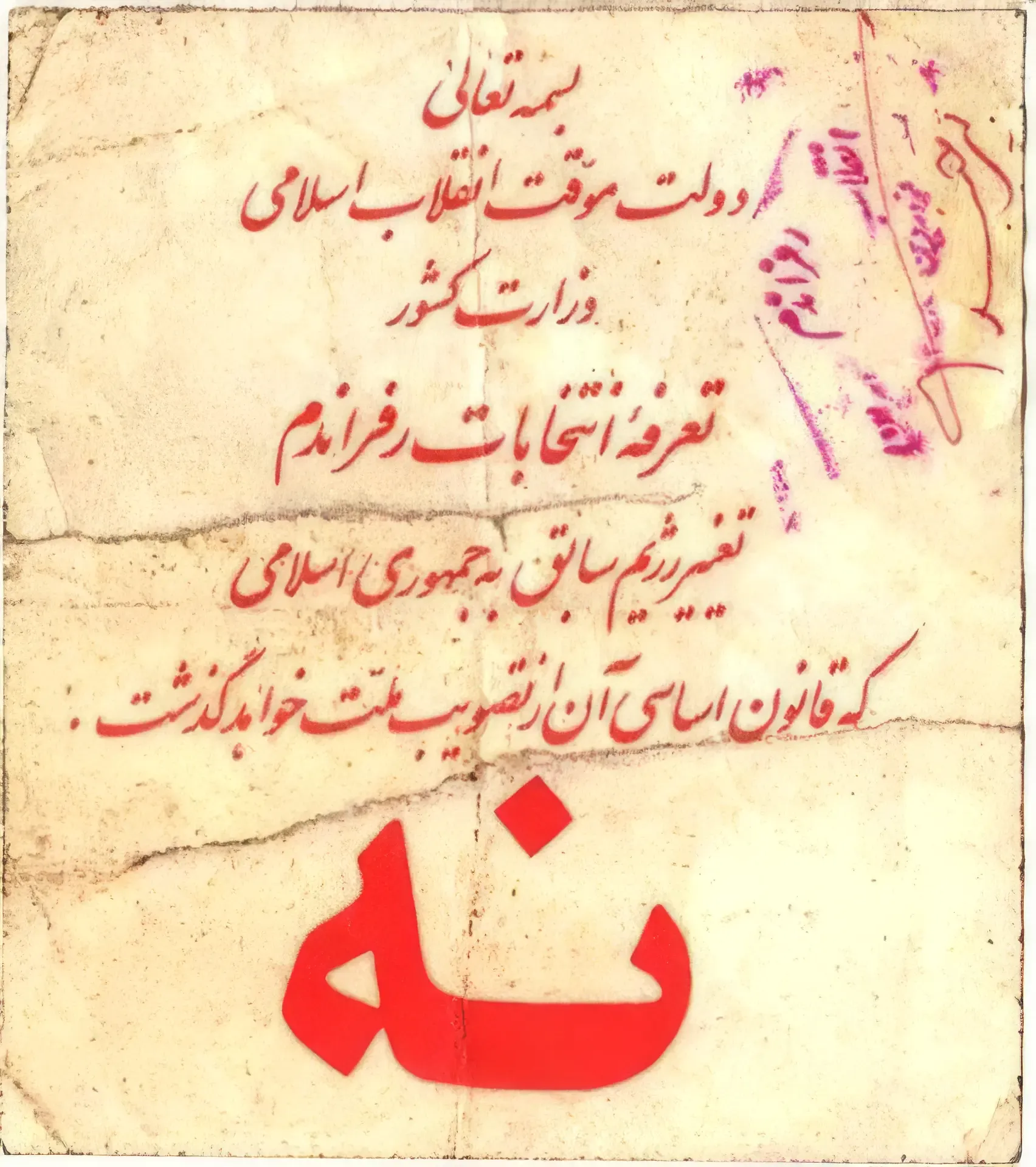 On March 30–31, 1979, Iranians went to the polls. The ballot contained a single question: Should Iran become an Islamic Republic? The choices were “Yes” (Green) or “No” (Red). The official result: 98.2% voted Yes.1