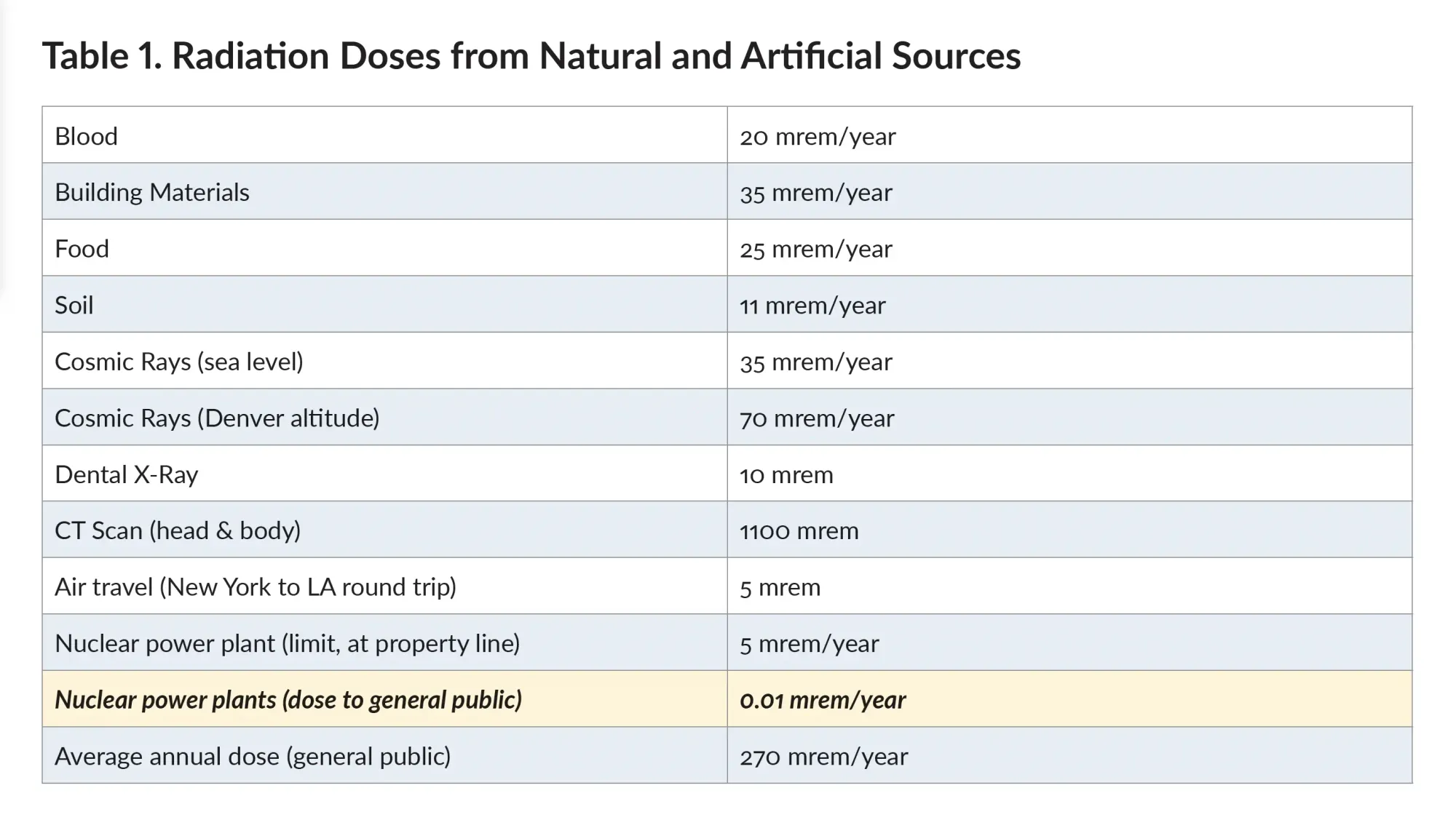 Examining Table 1, we see that the amount of radiation dose that the public receives from nuclear power plants is insignificant compared to what they receive from their own blood (which contains radioactive potassium-40), from the homes they live in, from the food they eat (watch out for bananas), from the medical care and air travel they enjoy, from the planet on which they reside, and from the universe in which the planet exists.
