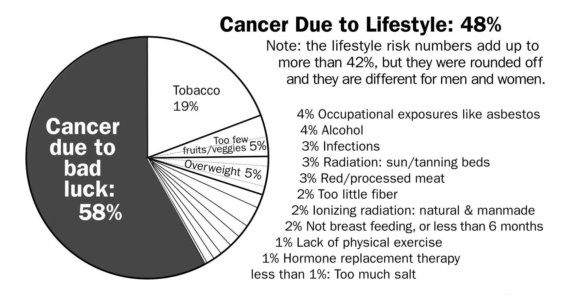 But those lifestyle changes can only reduce our risk of some cancers. We have no hope of preventing all cancers, especially those that are caused by heredity (like familial breast cancers) and by chance mutations in DNA. A good percentage of cancers can be ascribed simply to bad luck.