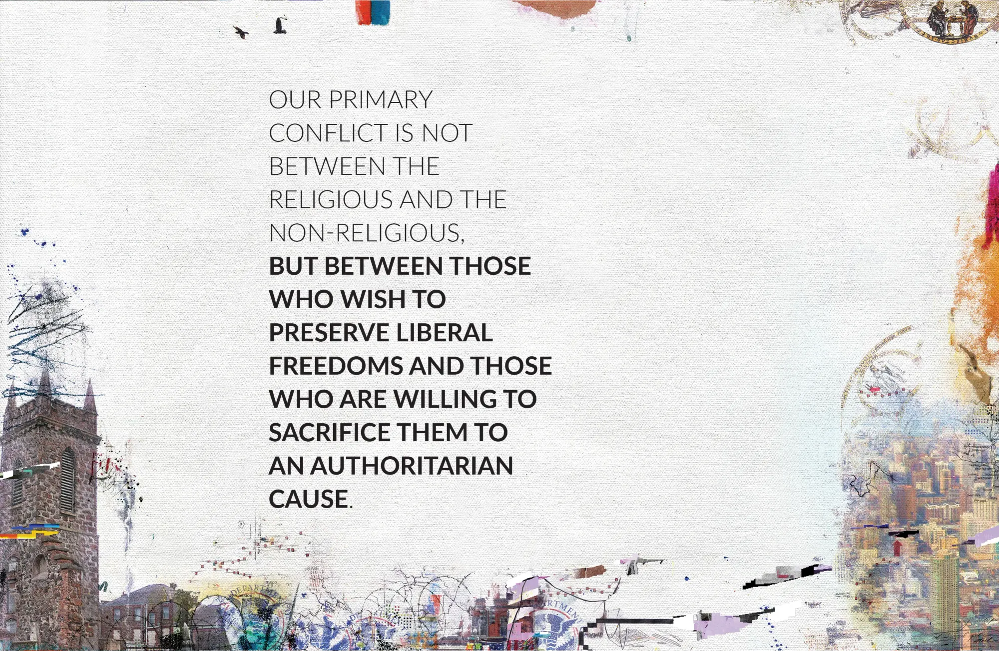 This is not to say that those of us who want to conserve the liberal philosophical underpinnings of Western modernity are ranged against the majority of Christians on this issue. Christians have been instrumental in upholding liberal democracy and constitutional freedoms. They, too, benefit from the separation of church and state, and typically sincerely wish to live in peace alongside people who do not share their beliefs. We can work together. Our primary conflict is not between the religious and the nonreligious, but between those who wish to preserve liberal freedoms and those who are willing to sacrifice them to an authoritarian cause.