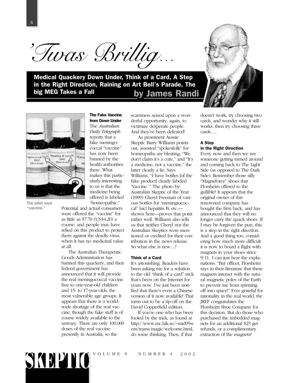 by Michael Shermer - ’Twas Brillig… Medical Quackery Down Under; Think of a Card; A Step in the Right Direction; Raining on Art Bell’s Parade; MEG Takes a Fall